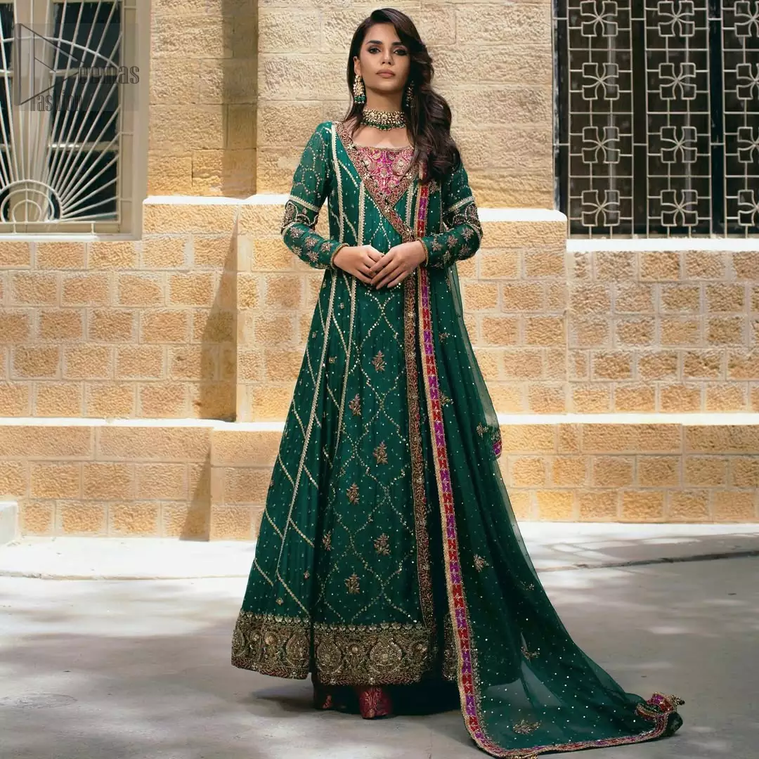 The bottle-green Angrakha is cut in a fit-and-flare shape and paired with palazzo pants and an organza dupatta for a lighter look. It is made from katan Banarasi jamawar, which gives the outfit a structured drape with a subtle sheen. Golden embroidery highlights the Angrakha’s edges, while chatta patti detailing adds a traditional touch without making the design heavy. The attire features exquisite full sleeves and a square neckline to keep the silhouette balanced and modest. The palazzo pants offer ease of movement, making the ensemble practical for mehndi events. It is a mesmerising and well-designed outfit that relies on colour, texture, and simple craftsmanship.