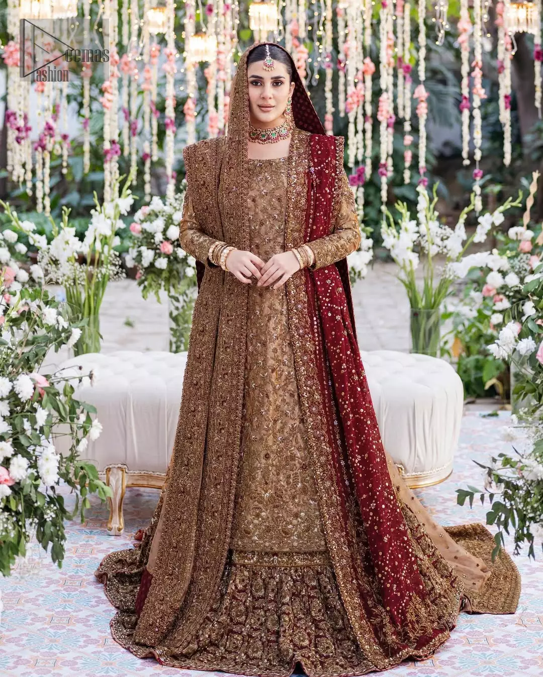 - Light Golden and Antique (Boski) Shades of embroidery include Dabka, stones, sequins, beads, silk threads, Pearls and Swarovski crystals.