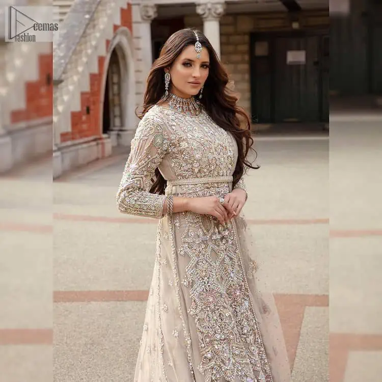 Fill the air with happiness, joy, and fun for your Nikah day. A handsome light fawn maxi is laboriously roasted with meticulously detailed multiple-colour hand embellishment, which further blooms with tilla, dabka, kora, naqshi, and Sitara magic. The jewel neckline of the following front open-back train maxi looks aesthetic when organized with three-quarter sleeves. It is paired with a lehenga in the same colour adorned with floral motifs and sequins spray spread all over to make your event more remarkable and shiny. Finish this article with the dupatta framed with magical four-sided borders and sequins sprayed to fulfil the dreamy fairy look.