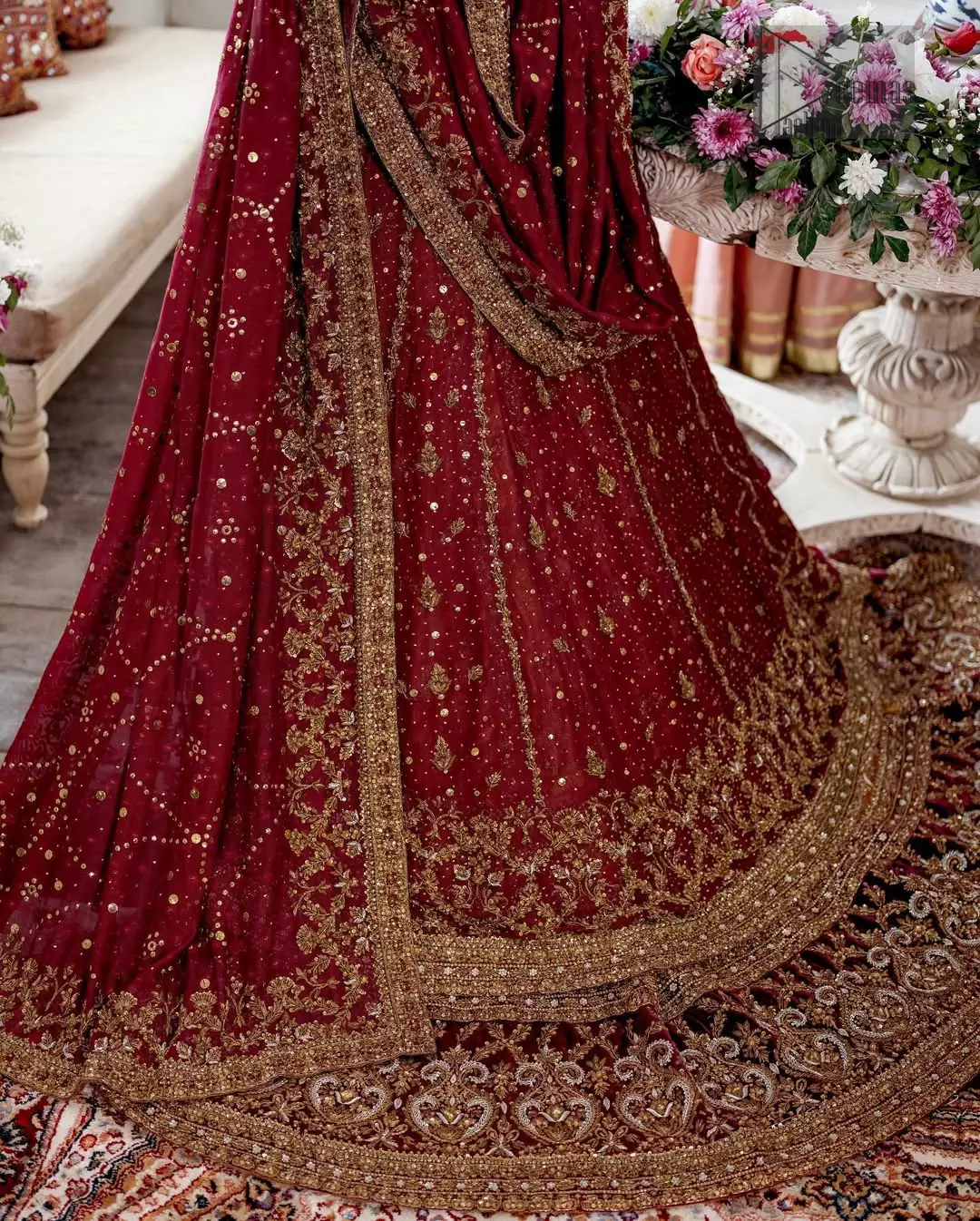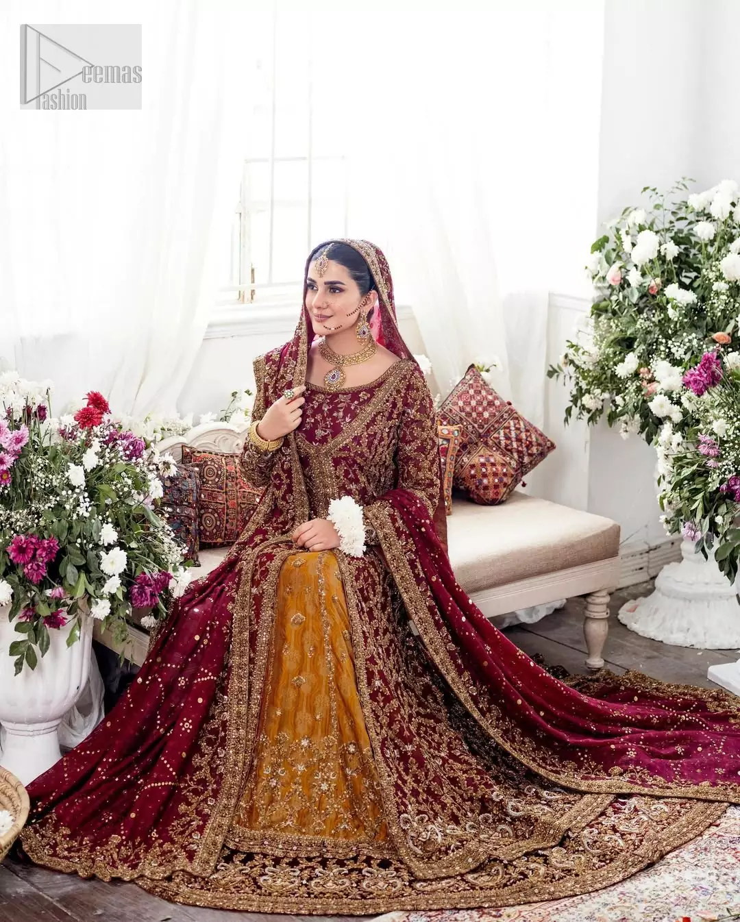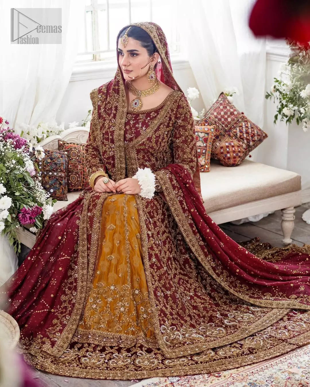 The Maroon Front Open Pishwas comes with a Mustard Farshi Lehenga that brings two rich tones together in a graceful harmony. The pishwas is crafted in katan banarsi jamawar, and its golden embroidery spreads across the maroon fabric with a soft, steady radiance. Each fold carries the weight of tradition and the quiet beauty of detailed handwork. The mustard farshi lehenga adds contrast and depth, flowing beneath with a regal ease that completes the look. Light organza drapes rest gently along the silhouette, to soften the structure without taking away its composure. The dress also features full sleeves and a round neckline that frames the upper half, giving the attire a balanced, elegant shape. This ensemble is an ideal pick for reception and first-day celebrations, when the bride demands presence, colour and charm.
