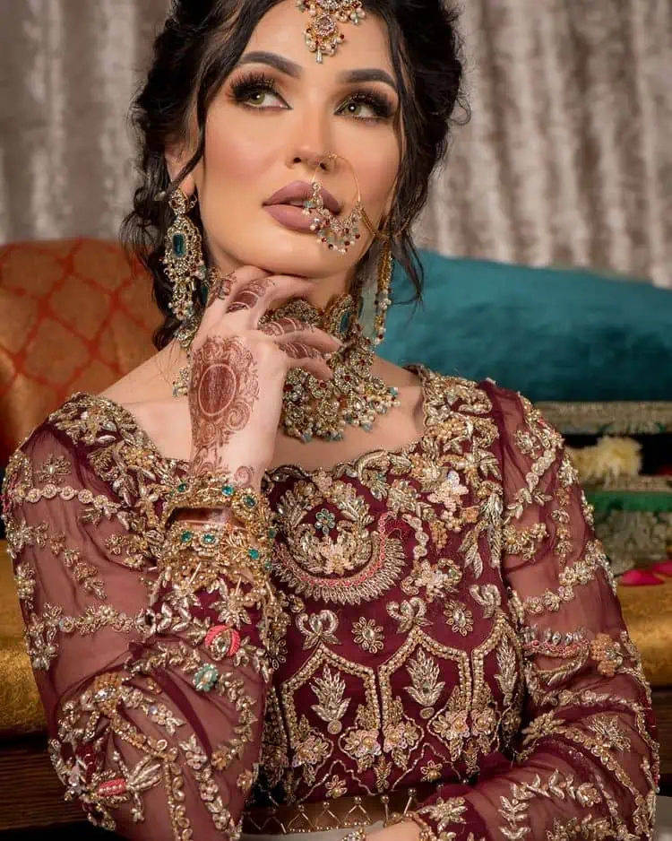 • Work includes kora, dabka, stones, sequins, beads, silk threads and Swarovski crystals.