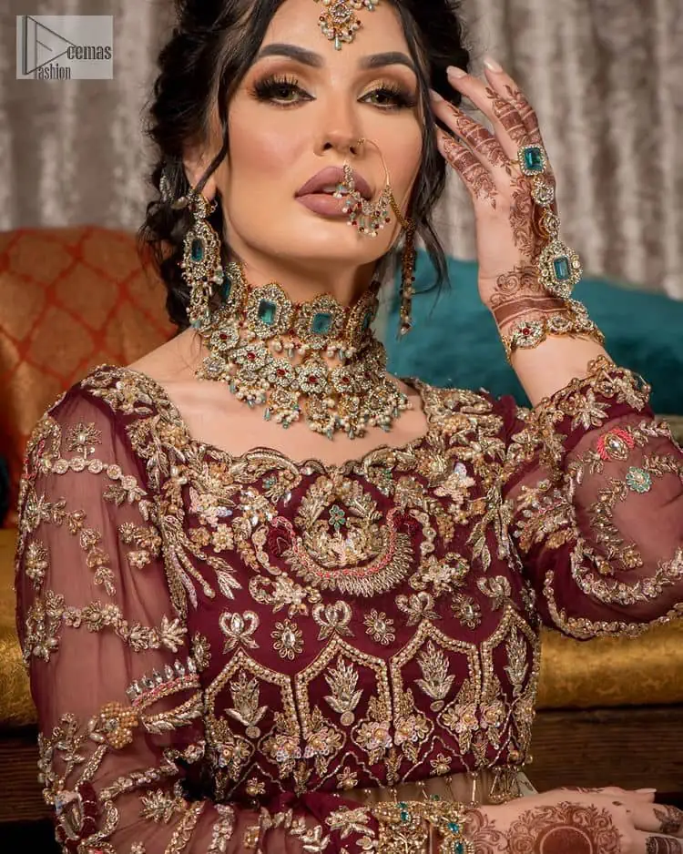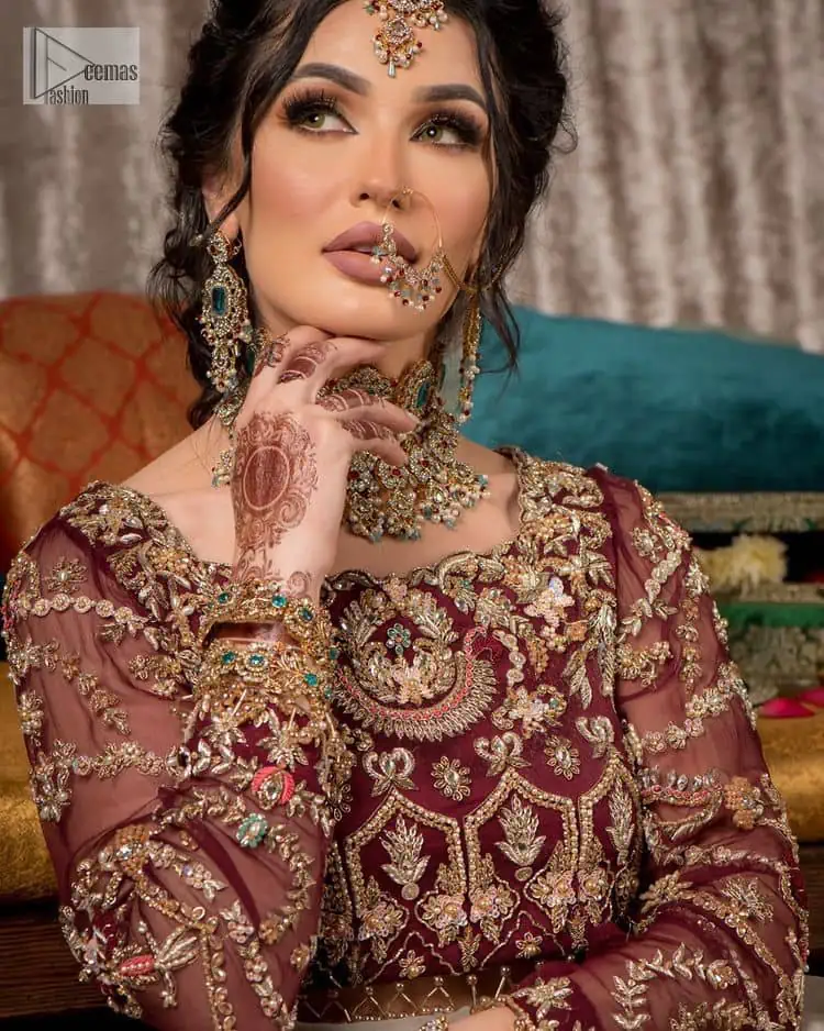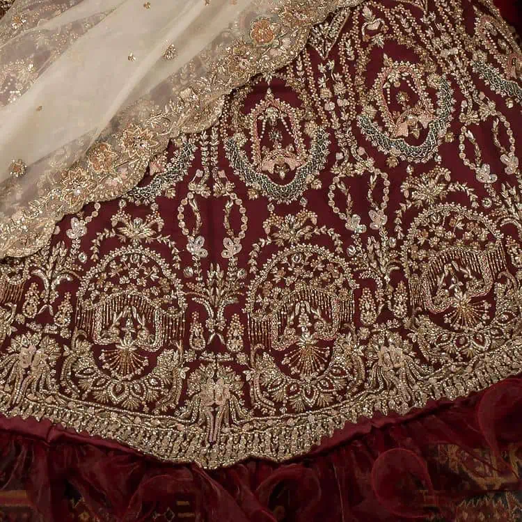Take your style up a few notches in this elegant reception piece. A pure organza maroon fluffy lehenga is beautifully adorned with golden embroidery and enhanced with tilla, sitara, pearls, dabka and zardozi work. It is paired up with a blouse choli with tilla motifs on the full sleeves along with boat shape neckline to make your Big day astonishing and remarkable. The ivory organza dupatta has a four-sided embroidery adorned with pearls and Sitara and is framed with a scalloped style.