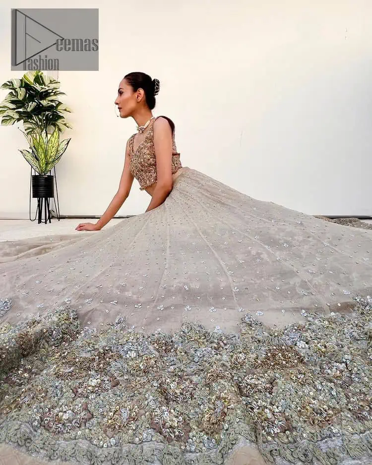 The perfect outfit for Walima to enhance your glow. This article starts with a dream rust blouse with a strap neckline and a prominent sleeveless style to embrace the romantic culture. The following blouse is fully embellished with golden embroidery that is prominent with tilla, dabka, kora, pearls, and sequins spray to give you a dreamy look. It is coordinated with an ivory can-can lehenga whose border is again rendered with golden embroidery and sequins sprayed all over to continue the look. Complete this outfit with a rust dupatta embellished with four-sided borders, and sequins sprayed all over to enhance the bride’s glow.