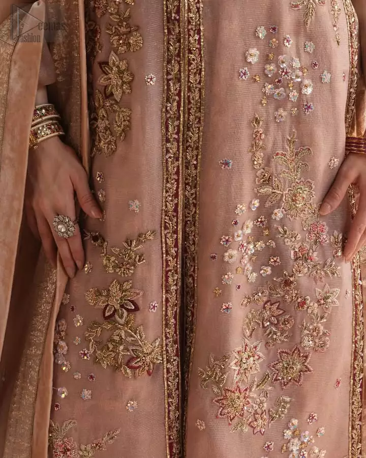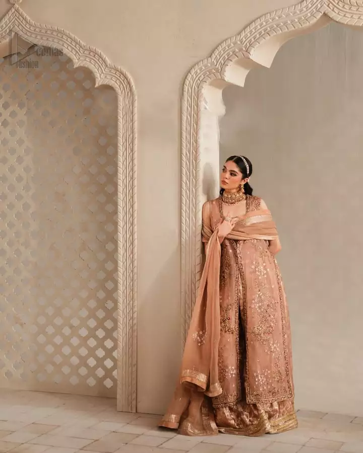 A soft symphony of elegance unfolds through this peach pink front open jacket paired with a charming sharara and delicate dupatta. The sleeveless jacket is beautifully tailored from fine net and organza, offering a graceful flow that enhances its modern yet traditional appeal. Golden and thread embroidery glimmers across the fabric, adding depth and luxury to its subtle hue. A refined square neckline completes the design, giving it a timeless touch. The side open pattern adds effortless flair, making it a perfect choice for festive evenings and Pakistani party wear. Every detail defines sophistication and celebrates your radiant presence.