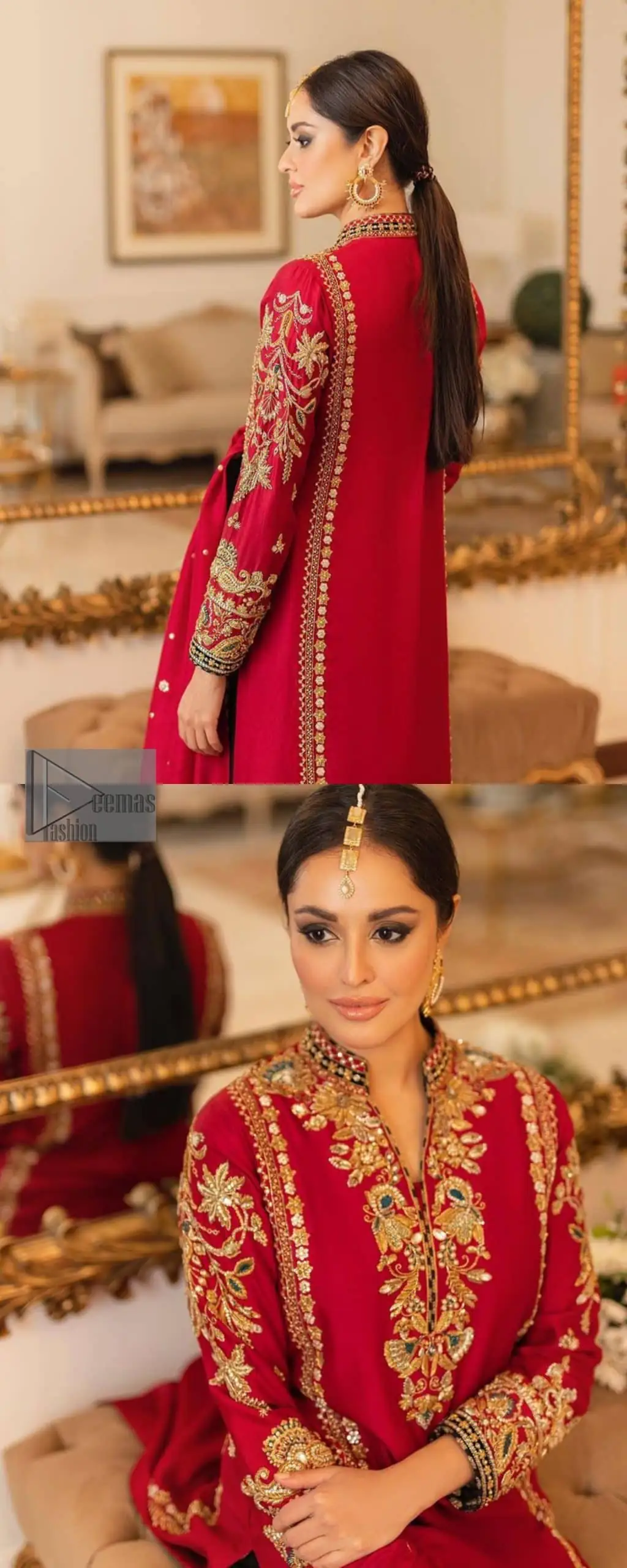 The forever favourite red dress channelling your inner diva. A luxury red long shirt rendered with intimate embroidery in golden colour to make your party blazing and remembering. It is highlighted with tilla, dabka, kora and pearls that are a perfect blooming outfit in our collection. The collar neckline and full sleeves add attractiveness to the outfit. It comes with black pants to give you a more formal look at any precious event. The border of the pants is adorned with golden embroidery as well. End up this look with a red dupatta which is embellished with a four-sided border and sequins spray all over for your constant love for red.