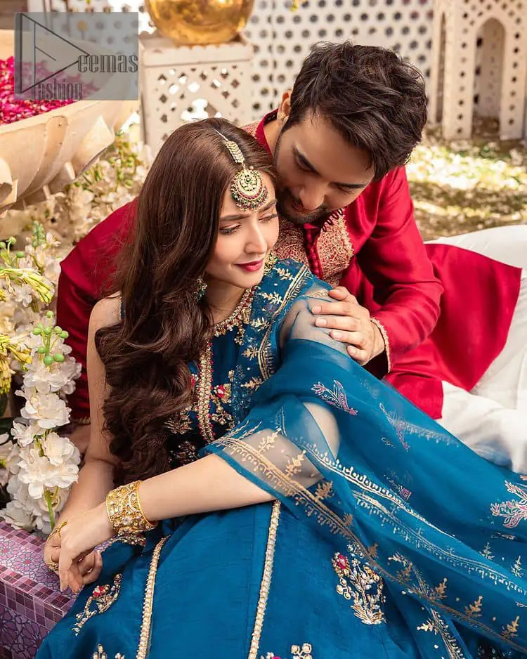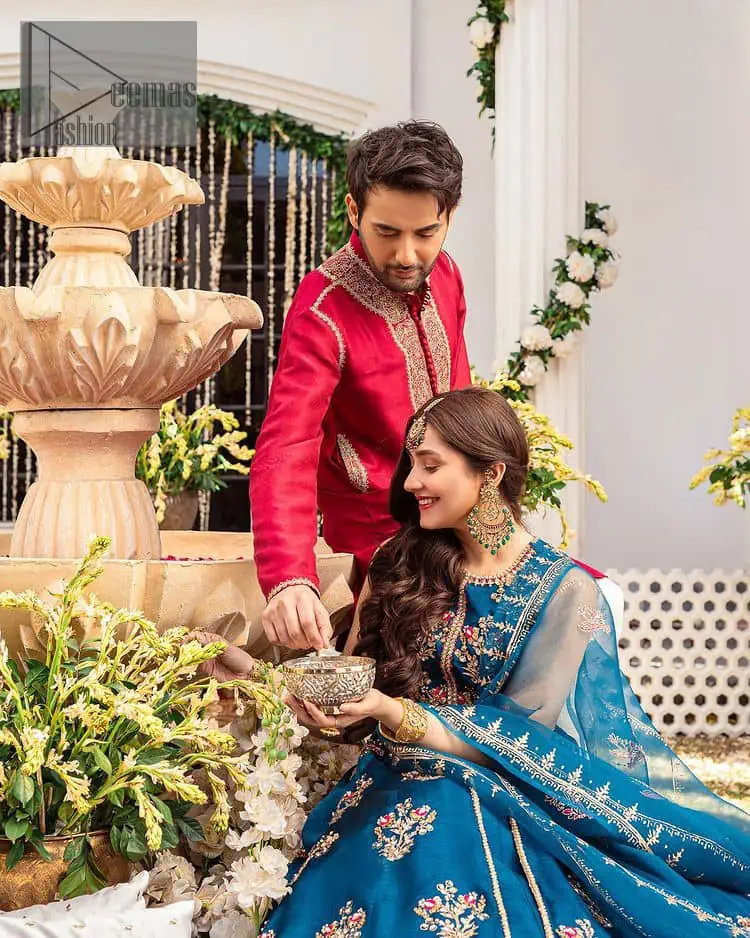 Blue defines your beauty and glows your face at any party event. Starting this article with a teal blue front open pishwas decorated with handsome golden embroidery placed like floral motifs. It is prominent with tilla, dabka, kora, and Kundan to enhance the blue gold. In addition to this, it is styled with a sleeveless and round neckline to make your day better and the best. The following pishwas are coordinated with a can-can lehenga whose border is again adorned with heavy embellishment. Complete this party look with a teal blue dupatta rendered with four-sided borders and floral motifs to put a glow on your face.